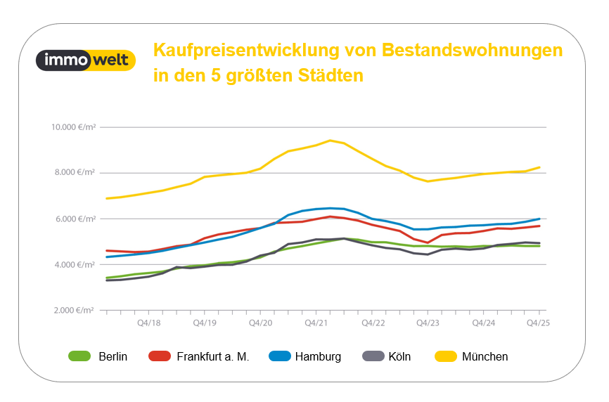 Das geht aus der aktuellen Ausgabe des immowelt Preiskompass für das 4. Quartal 2025 hervor. Darin wurde analysiert, wie sich die Angebotspreise von Bestandswohnungen und Bestandshäusern in Deutschland sowie den 15 größten deutschen Städten mit mehr als 500.000 Einwohnern entwickelt haben.